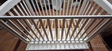 Vendo culla in legno tenuta benissimo, riverniciata e in ottimo stato, con 4 ruote girevoli, e anta scorrevole che si alza e abbassa per facilitare l'uscita. Facile da comporre e completa di materasso.