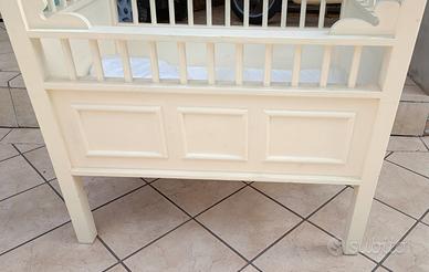 Lettino per neonati realizzato a mano in Legno di abete 100%. La culla è stata rifinita in delicato color crema. La struttura, molto solida e robusta , misura 70 cm x 98 cm ed è alta 1 metro. Incluso nel prezzo il cuscino e il materasso che misura 55cm x 90cm.