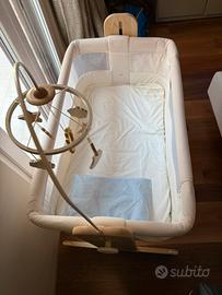 Struttura in legno massiccio di frassino, tessili 100% cotone, regolabile in altezza in 5 posizioni e funzione di regolazione laterale. Mamma&Me ha la funzione dondolo integrata e include sia la giostrina in legno sia il materasso.