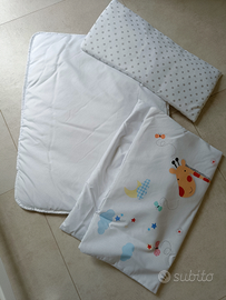 Include: struttura e base in legno, quattro ruote con freni, materassini e cuscino piatto con fodera, tessuto beige e trasparente, piumino.