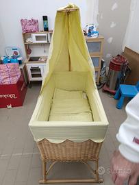 Culla in vimini, con struttura a baldacchino e dondolante. Completa dei tessuti per rivestirla, inoltre regalo anche il materasso. La culla è in perfetto stato ma vanno carteggiate le gambe perché si sono annerite con il tempo ( vedi foto)