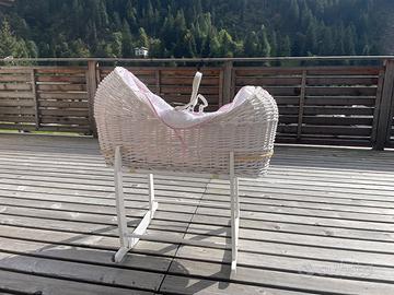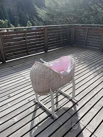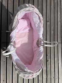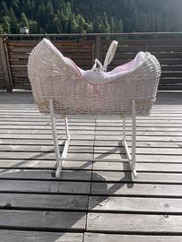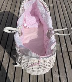 Culla in vimini Clair de Lune, bianca, con biancheria bianca e rosa, materassino e supporto a dondolo bloccabile.