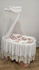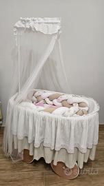 Vendo splendida culla per neonato/a in vimini intrecciato con struttura in legno massello, completa di rivestimento tessile artigianale fatto a mano, in condizioni eccellenti.