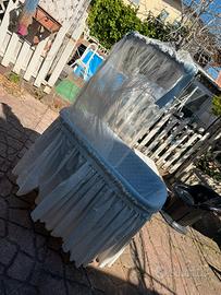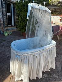 Culla in vimini rivestita con pizzo dí sangallo e tulle colore celeste interamente fatta a mano. Condizioni come nuova. Necessita solo di un lavaggio ai tessuti perche impolverati