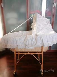 Culla in vimini intrecciato, composta da cesta con maniglie e supporto con rotelle.