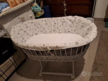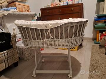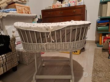 Vendo culla come nuova già montata. Ampio cesto in salice intrecciato con base in pino massiccio, rotelle con freni sicure e flessibili.
