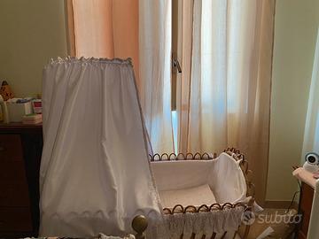 Culla in vimini rivestita con paracolpi e tenda compresa di materasso e cuscino.