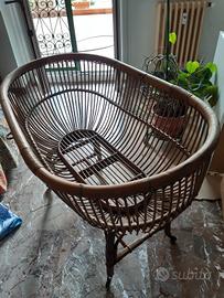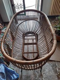 Culla in bamboo e vimini vintage anni 70 con ruote. copertura bianca in cotone compresa senza costi aggiuntivi. No spedizione.