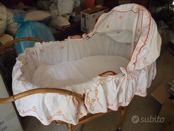 Culla con capottina completa di 3 fodere: 1 in piquet di cotone bianco ricamata a mano a fiorellini e deori arancione, 1 in tela di cotone blu avio con stampa orsetti, 1 in tela di cotone binca con stampa ARISTOGATTI. Cesto estraibile; misure: cm. 90x50x33 profondità. Sostegno con ruote piroettanti. Misure massimo ingombro:cm. 107 altezzax 100 lunghezza x 50 larghezza. Adatta per bimbi fino a 8/9 mesi. Culla + 1 fodera a scelta € 120. Torino, zona corso Belgio.