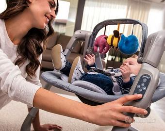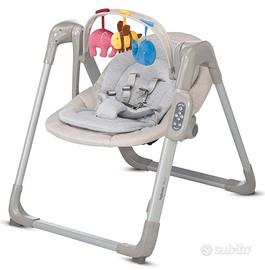 RITIRO PREVIO APPUNTAMENTO A Parma o a Brescello GUARDA LE ALTRE MIE INSERZIONI SE INTERESSATI AL GENERE DI ARTICOLI acquisti questo articolo e avrai lo sconto del 50% sul secondo articolo (lo sconto si applica all'articolo con prezzo inferiore tra i due) L’altalena Wave può essere utilizzata dalla nascita del tuo bambino fino ai 9 Kg di peso. Aiuta a stimolare lo sviluppo cognitivo del bambino, grazie a tre simpatici e soffici personaggi colorati con effetti tattili e sonori. È dotata di: timer di auto spegnimento (8, 15, 30 minuti); possibilità di collegamento di una sorgente audio esterna; sistema di blocco oscillazione per agevolare l’accomodamento del bambino. L’altalena Wave occupa pochissimo spazio quando richiusa (64 x 79 x 20 cm), rimanendo in piedi su se stessa. Da aperta misura solo 64 x 67 x 78 cm. Dotata di: soffice riduttore per i primi mesi, realizzato in maglina di jersey, con retro in rete 3D per favorire la circolazione dell’aria e la traspirabilità; ampia seduta imbottita, reclinabile in 2 posizioni; cintura di sicurezza rivestita in morbido jersey per evitare arrossamenti alla delicata pelle del bambino; piedini anti scivolo. Il rivestimento e il riduttore sono facilmente sfoderabili e lavabili a mano a 30°.