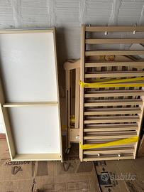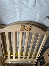 Vendo per inutilizzo culla in legno naturale con disegno di orsetti sulla spagliera, composta da cassetto inferiore e sponde regolabili