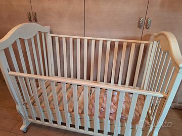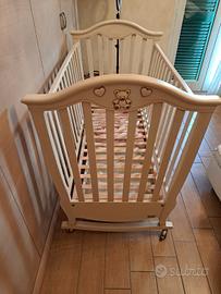 Lettino con cassetto, struttura in legno di faggio. Cassetto con scorrimento su guide di plastica con un nuovo meccanismo per una facile e veloce regolazione. Piedini con rotelline a scomparsa che permettono lo scivolamento del letto in avanti e indietro. Una sponda fissa e una sponda mobile