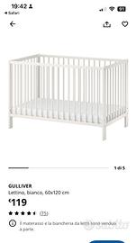 Vendo lettino/culla modello Gulliver di colore bianco come nuovo più accessori. Inclusi nel prezzo: Materasso Cuscino per lettino Salva materasso cerato Telo coprirete Piumino per lettino 4 set biancheria (federa, copripiumino e lenzuolo con angoli) Coperta in ciniglia (utilizzabile anche come copriletto) Peluche unicorno 🦄 Tutto ben conservato e pulito. 👉 Segnalo solo una piccola perdita di colore/ammaccatura (visibile nell’ultima foto). Ritiro solo presso Borso del Grappa .