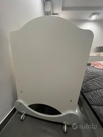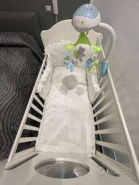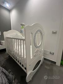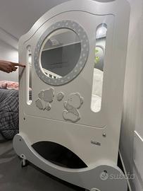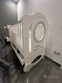 Vendo per passaggio a letto piu grande, culla in legno bicolore in bianco e grigio chiaro ad oblò e materasso ortopedico in Aloe Vera , completo di set coordinato composto da lenzuolino in cotone fresco ed inserti in Swarovski motivo orsetti.