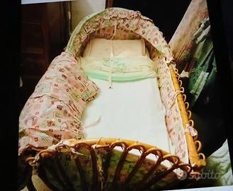 Culla o lettino in vimini completo di materasso cuscino lenzuolo e frangia