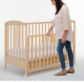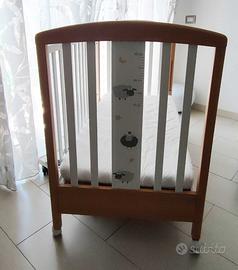 Lettino modello Pekos Foppapedretti. Buone condizioni. Con una sponda fissa e una regolabile/smontabile, rete a doghe in legno di faggio; dotato di 4 ruote piroettanti di cui 2 con freno e di ampio cassetto; decorato pecorelle, stelle e luna serigrafate; Dimensioni: 131 x 71 x 103 cm.