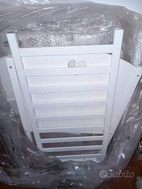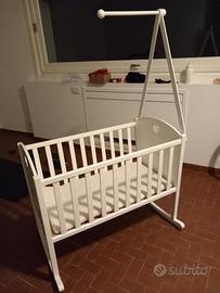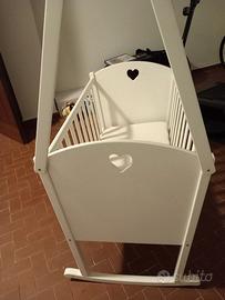 Bellissima culla per neonato in legno massello di abete smaltato di bianco con dondolio e blocco.