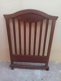 Culla in legno colore noce, ben tenuta completa di tutti i pezzi, ha anche il cassettone. Le foto non sono complete in quanto è conservata..