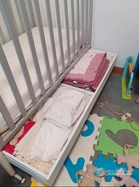Vendo culla lettino per bimbi - materasso compreso. Misure culla: Profondità 70 cm Altezza 104 cm Lunghezza 130 cm Sponde rivestite con guaina gengivale, la sponda in avanti è regolabile in due altezze. Nella parte inferiore è presente un cassetto diviso in due scomparti 4 ruote di cui due con freno Materasso sfoderabile e già dotato di coprimaterasso impermeabile
