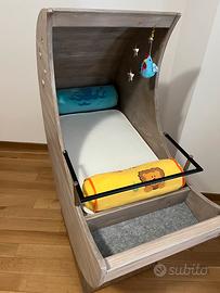 Culla per bambini neonati a forma di Luna in legno massello e piano forato per ventilazione. È su ruote (su richiesta si possono togliere per mettere dei piedini fissi) ed è stata realizzata da falegname professionista.