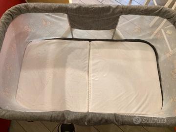 Vendo culla besrey colore grigio con retina azzurra con disegni di orsetti e conigli. Pieghevole, con zanzariera, cuscino, porta biberon, cestino sotto e possibilità di mettere movimento dondolo girando i piedini.