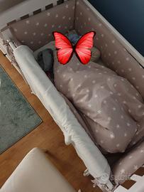 Vendo lettino marca Picci modello Lella con tessili come da foto. Legno laccato bianco. Rotelle bloccabili per facile spostamento. Incluso materassino. Le sponde si possono regolare a varie altezze per posizionarlo fianco letto matrimoniale o per trasformarlo in divanetto da bambini. Tutto in perfetto stato. Ora è smontato ed imballato con cura, con tutta la sua viteria.