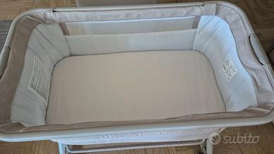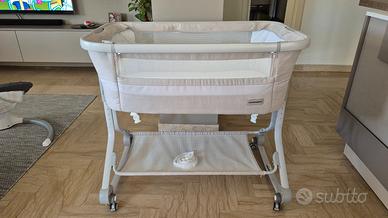 La culla ha un fianco apribile per consentire la modalità co-sleeping ed è regolabile in altezza in 6 posizioni indipendenti, adattabili anche per la funzione anti-reflusso. La struttura in alluminio è leggera e facile da spostare, grazie alle 4 ruote gommate e piroettanti con freno: ruotando le ruote di 180°, la culla si trasforma in modalità dondolo. La cura dei dettagli è massima per garantire il miglior comfort al neonato: la parte interna ha tessuto morbido al tatto e aerazione naturale per un miglior ricircolo d’aria. Ampio ripiano portaoggetti e materassino incluso.