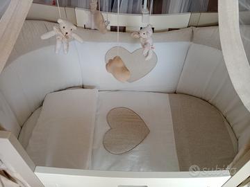 Culla Sofia Feritre bianca e tortora, culla con spigoli arrotondati per la massima sicurezza, ampio e comodo cassetto,ruote piroettanti con gomma anti traccia di cui due con freno. La culla è dotata di materasso, kit velo e zanzariera, coordinato tessile ( piumone e paracolpi), cuscino e paracolpi.