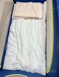 Vendo con 2 cuscini, 1 piumone, 1 Copertina più pesante (quella con gli orsacchiotti), 2 Lenzuola (quella con il bordo rosa e quella con la fantasia degli angeli, 1 coprimaterasso e 3 Federe per cuscini (quella con la fantasia degli angeli e le altre due bianche). Tutto il corredo che ho appena elencato è stato usato.