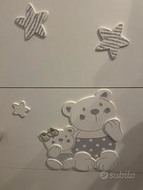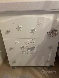Culla neonata/o con fasciatoio , in ottime condizioni di colore neutro bianco e orsetti grigi. Culla si compone di tiretto per abbigliamento nel vano sottostante e oblò frontale al lato dei piedini . Fasciatoio composto da tre cassetti ,materassino per il cambio e vaschetta bagnetto. Tutto funzionante Azienda Erbesi