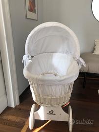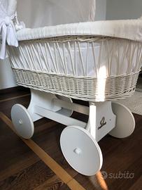 Culla neonato in vimini, e rivestimenti in cotone bianco; ruote funzionanti