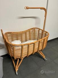 Miniculla in rattan con ruote con freno e fodera paracolpi (mai usata) in tessuto di cotone.