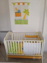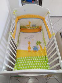 La culla per l'infanzia misura 130x88x112 cm completo di materasso usato ma in ottime condizioni più piumino invernale più paracolpi più porta spazzole più velo zanzariera coordinato Gigi e Lele.