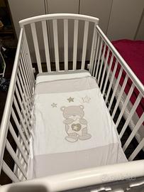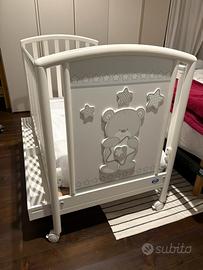 Vendo bellissima culla bianca con decoro orsetto, completa di: • 🛏️ Materasso incluso • 🛏️ Piumino con completo abbinato (lenzuola e copripiumino coordinati) • 🧸 Design elegante e dolce, ideale sia per bimbo che bimba • 📦 Cassetto capiente sotto il materasso, perfetto per riporre biancheria o accessori • 📏 Sponde regolabili in altezza per facilitare l’accesso e adattarsi alla crescita del bambino • 🚼 Ruote con freno, comode per spostarla all’interno della casa ℹ️ Nota importante: ci sono piccoli segni evidenti dove lo smalto è usurato (vedi foto), un difetto puramente estetico, ma che non compromette la funzionalità o la sicurezza della culla. Tutto in buono stato, usata con cura. 💰 Prezzo: 130 € tutto compreso Contattami in privato per ulteriori foto o dettagli!