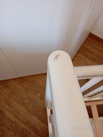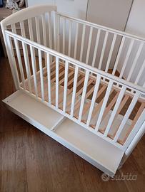Culla con spondine abbassabili entrambi i lati,due altezze per il materasso, cassettone sotto, mai usata , unico difetto una scheggiatura sopra .