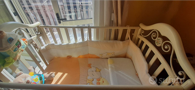 Vendo culla per bambini completa di materasso, cuscino,paracolpi,lenzuola e coperta tutto coordinato ,ha pure il cassetto sotto il materasso in buone condizioni. Prezzo non trattabile e ritiro a domicilio" già smontata"