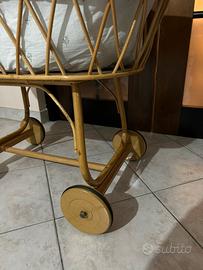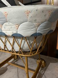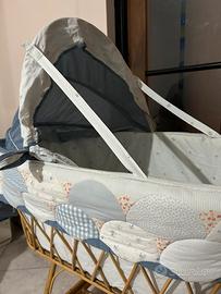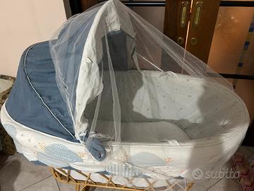 Culla per bebè , in vimini su ruote , usata pochissimo, in ottimo stato, con rivestimento in tessuto imbottito, comprensiva di materassino e zanzariera.