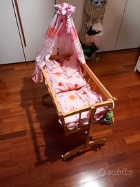 Vendo culla per le bambole, in legno, con rotelle, completa di tendina e coperte. Come nuova. €30