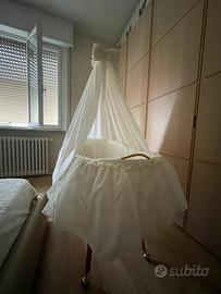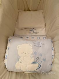 Culla in vimini con imbottitura laterale , completa di materasso ( incluso nell’ acquisto accessori quali coprimaterasso, copricuscino, lenzuola e due piumoni)