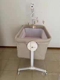 Struttura stabile e sicura, con ruote bloccabili per facilitarne lo spostamento. Design moderno nei colori beige e bianco, con lati in rete traspirante per una migliore ventilazione e visibilità del bambino.