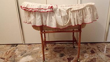 Cesta in vimini mobile con manici per il trasporto, dotata di materasso, cuscino e rivestimento in cotone. Con supporto in bambù completo di ruote.