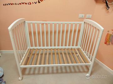 Vendo culla per neonato di colore bianco, completa di materasso (ortopedico e anallergico) e paracolpi che ricoprono tutti i lati. Le sponde sono regolabili a due altezze.