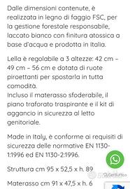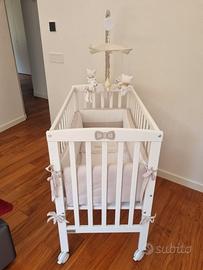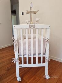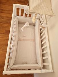 In perfetto stato, utilizzata pochissimo, completa di materasso, paracolpi, trapunta invernale, 2 kit lenzuola e giostrina