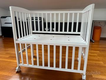 Lettino - culla Lella laccato bianco trasformabile completa di tessili e materasso. Predisposta per 4 altezze (con ruote e senza ruote): h bassa c/ruota 46 cm h bassa s/ruota 40 cm h. alta c/ruota 52 cm h. alta s/ruota 46 cm