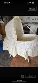 Culla in vimini completa con materassino e cuscino antisoffoco.