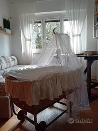 Culla in vimini con rotelle, completa di materasso, imbottiture, rifiniture in cotone bianco, sangallo e velo di toulle.