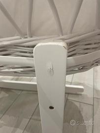 Culla in vimini a dondolo per neonati (fino a circa 3/4 mesi) con possibilità di blocco. Cesta con manici, sfoderabile, capottina che si alza. La cesta si toglie dalla struttura.
