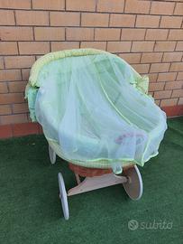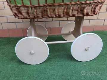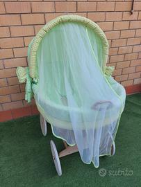 Culla in vimini dimensioni 105 x 65 x h. 75 cm , composta da cesta in vimini montata su telaio in legno con ruote, completa di rivestimento, cappottina, zanzariera, materassino e cuscino ottimo stato