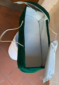 Cesta culla in velluto verde originale anni 60/70 in ottimo stato di conservazione con tutti gli accessori. Fornita di “zampe” per appoggio, base un legno e materassino.