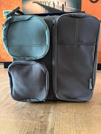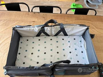Comodissima culletta da viaggio utile per i viaggi, occupa pochissimo spazio, si porta come se fosse una borsa con tasche laterali come si vede da foto per pannolini salviette cremine e quant’altro. Usata pochissimo, praticamente nuova!